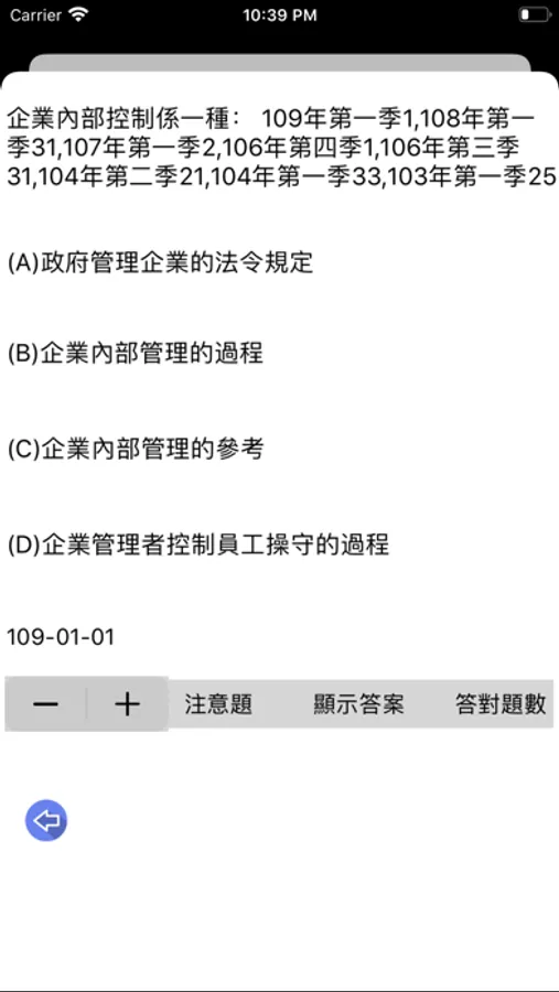 台灣企業內部控制筆試考試一年只有四次, 電腦考試可隨時報考,可以讓您更快速拿到證照. 本手機版的考題來自歷屆筆試考題,讓你更穩的拿下高分. 如果您沒有一次考過,這手機版會是您不可錯過的最佳輔助工具.