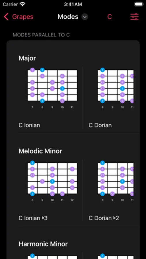 Finding a concise app containing a detailed list of the modes was impossible. Grapes has a simple display without any of the complexity of other guitar apps, while still offering an in-depth collection of scales. We've also included a chord selector and several chord charts.