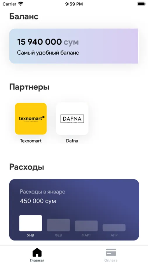 Например, Вы приобрели в Мае мягкую мебель, в Июне смартфон и в Июле духи. Потраченная сумма составила 6 600 000 сум от общего лимита на карте. Далее сумма за каждую покупку складывается в единый ежемесячный платеж и делится пропорционально на установленный срок. Возврат потраченных средств производится спустя месяц, в следующем за тем в котором была совершена покупка, путем автоматического списания с заработной карты, указанной при регистрации. Преждевременно вернуть потраченную сумму можно в приложении n-qulay.