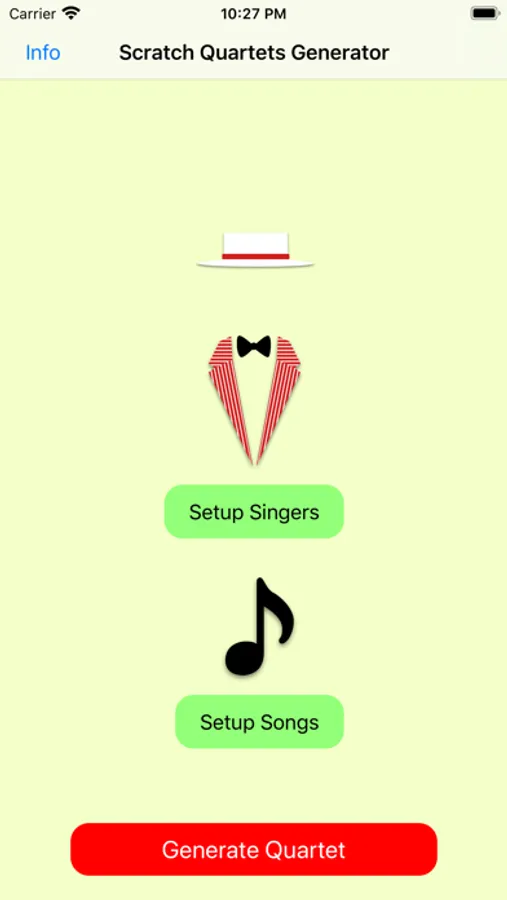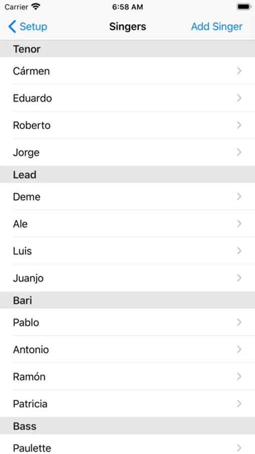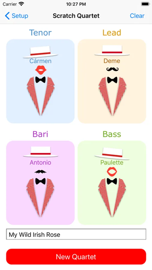 You add singers for each voice and add the songs that can be performed and the app choose the singers and the song to perform from those lists each time you tap on the new quartet button.