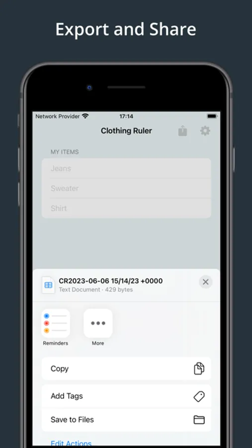 - Export measurements for multiple items to a .csv file. Save or share it via Mail, Messages, AirDrop, and more.