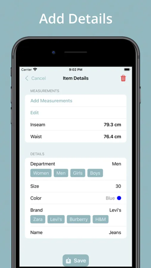 Add measurements, colors, sizes, and item details with one-tap suggestions—no more typing everything manually.