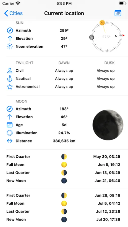 - Plus: see twilight start and end, moonrise, moonset, and upcoming phases.