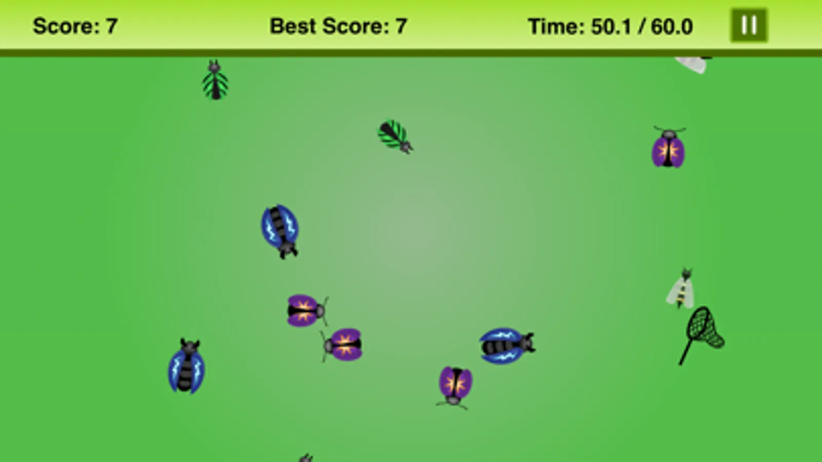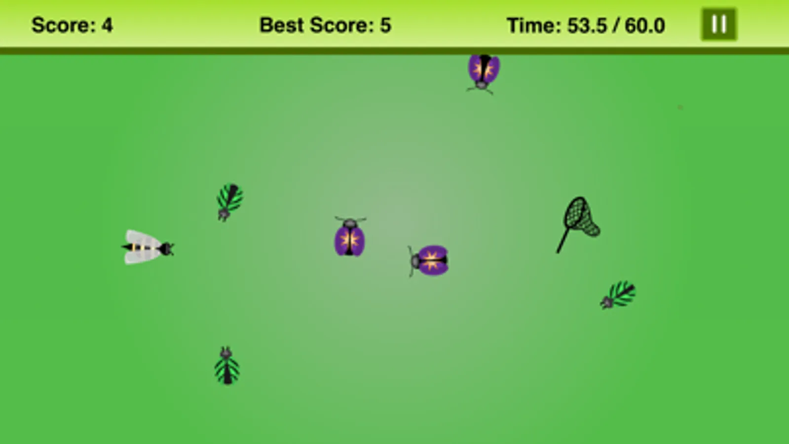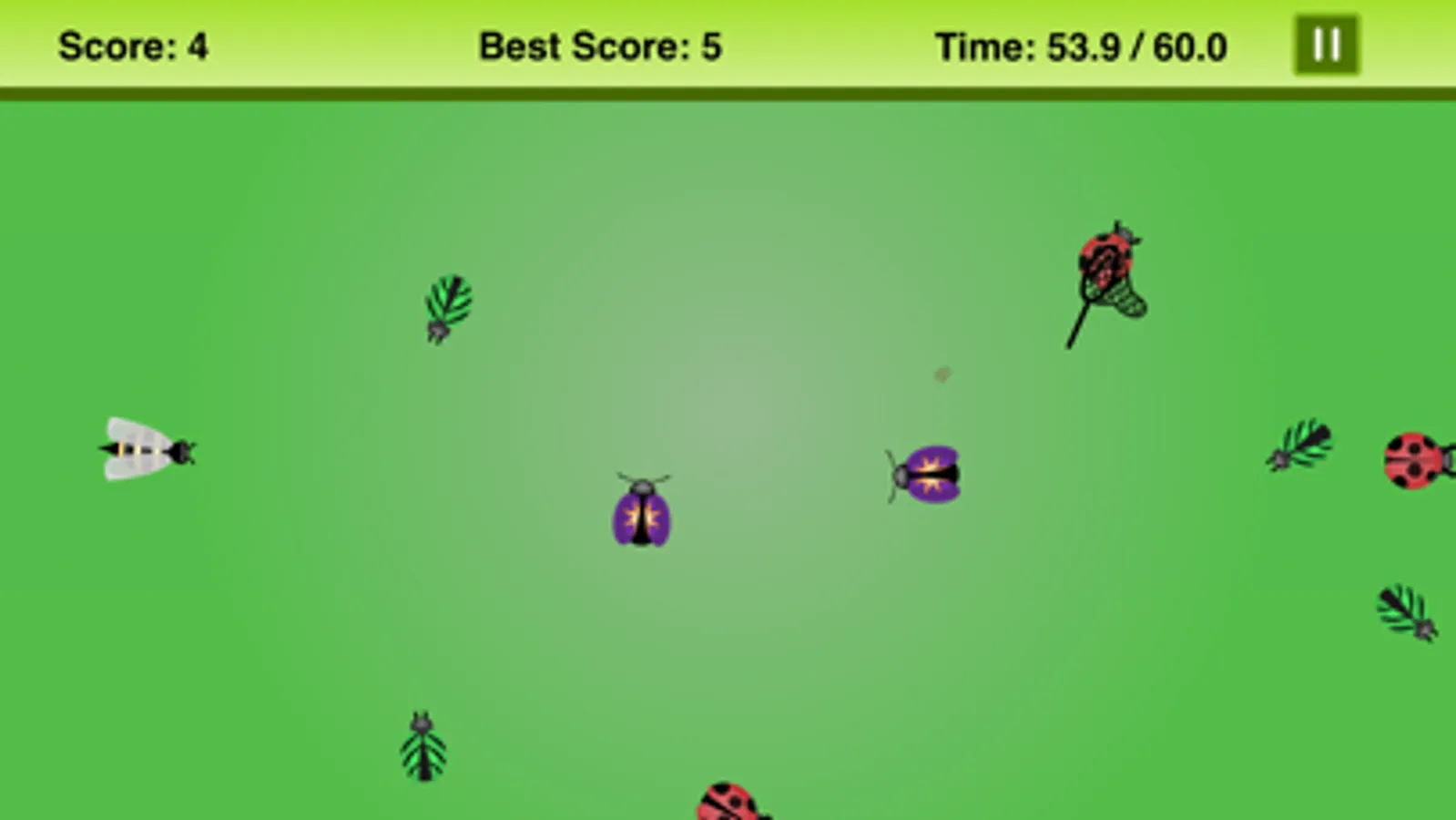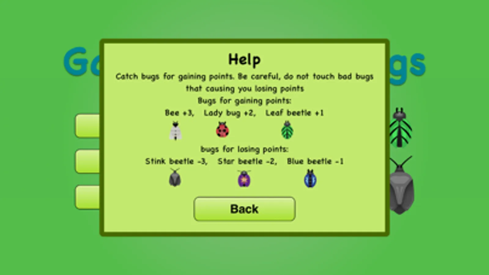 Be careful, do not touch bad bugs that cause you to lose points! bugs for gaining points (Bee +3, Lady bug +2, Leaf beetle +1) bugs for losing points (Stink beetle -3, Star beetle -2, Blue beetle -1)