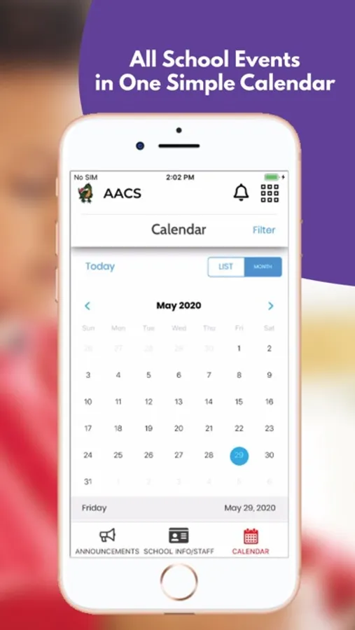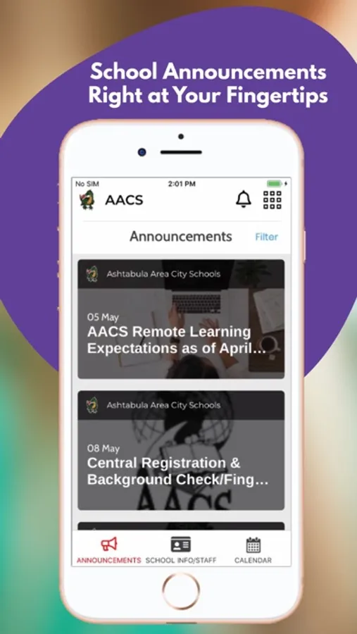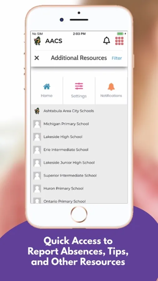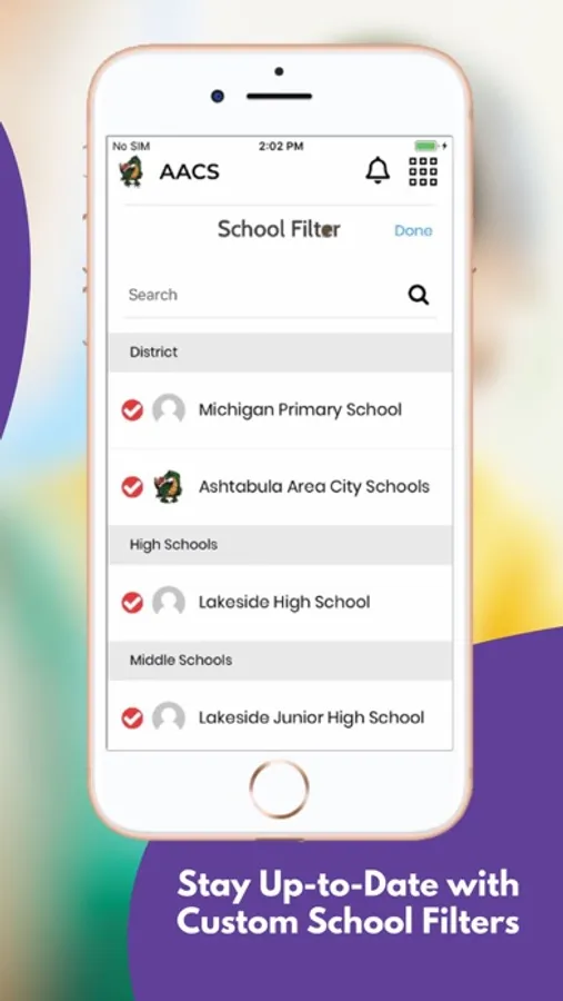 The app includes information for the district and all schools. Filter by the school your child attends to feature information for that school.