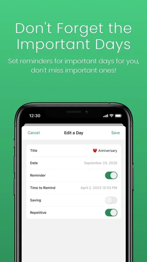 - The app will reminds you to special days by sending notifications at a time you specify.
