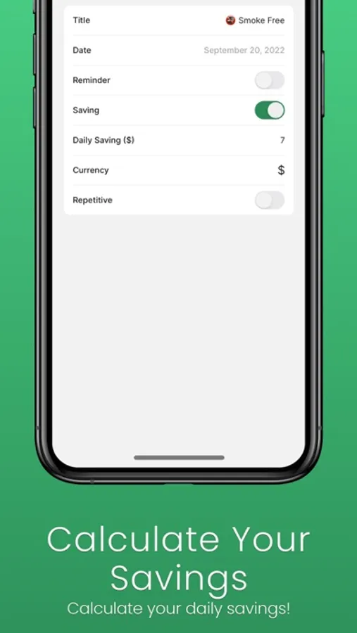 - Calculates your total savings with Daily Savings. (Like quitting smoking)