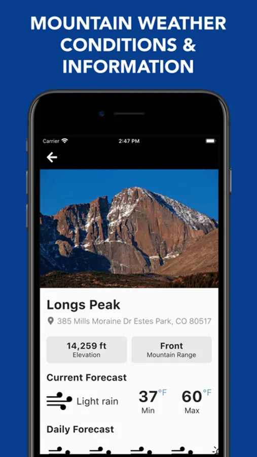 Checkout out all 53 of Colorado's fourteen thousand foot mountains. Plan your trip with hourly & daily weather reports, route information and more.