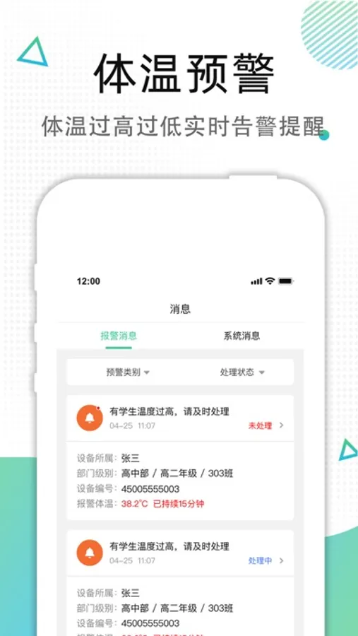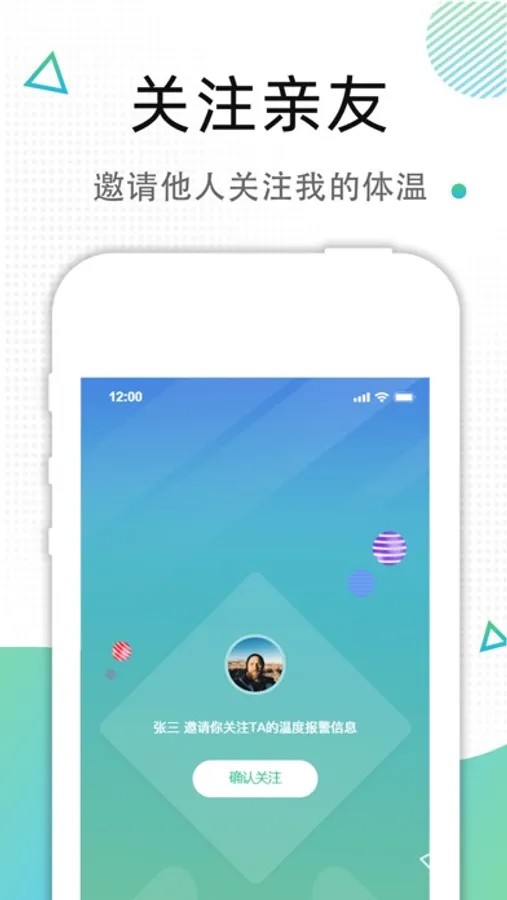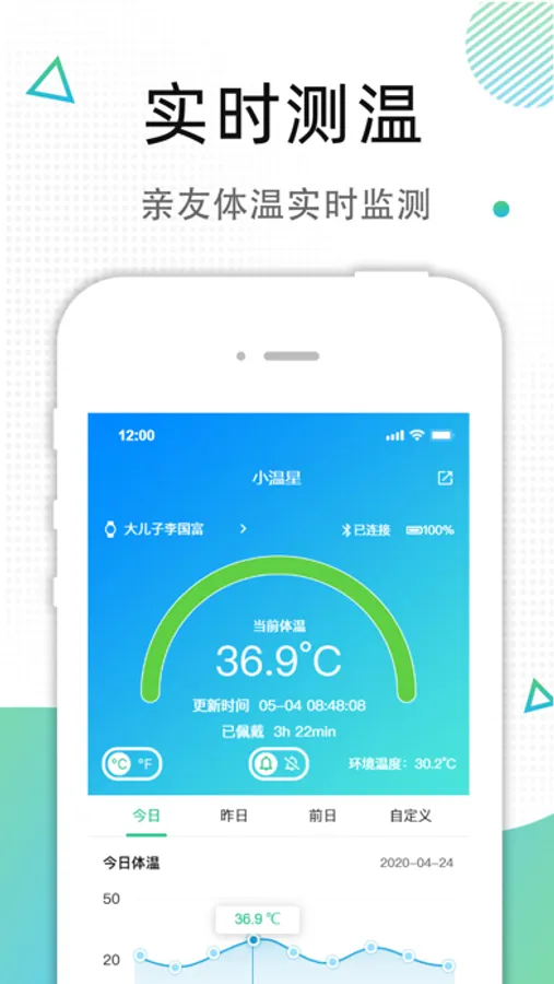 小温星APP通过与智能测温设备相连,提供准确实时的人体体温监测服务,可对自己及家人朋友、学校学生、医院病人、工厂工人、企业员工、景区游客等人员实行体温监测和区域离线提醒,及时发现体温及位置异常人员。同时可邀请亲朋好友一同关注自己的体温变化、支持一键分享给医生,及时处理异常,是您贴心的体温监测系统!