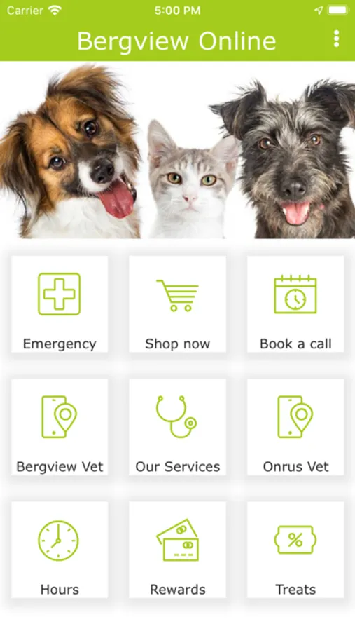 Bergview Online is the official app for Bergview Veterinary Hospital and Onrus Veterinary Clinic offering clients the opportunity to shop for pet food and other items. You can also book a telephone or video chat with one of our vets from the app.