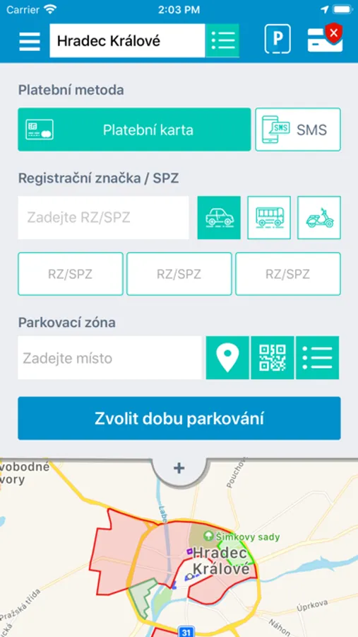 Pokud aplikace získá od uživatele oprávnění k načítání pozice zařízení je zakoupení parkovacího lístku otázkou zápisu registrační značky parkovaného vozidla a výběru doby parkování.