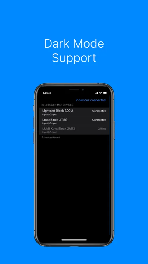 Open Conji to get a list of discoverable MIDI Bluetooth devices. With only one click you can connect or disconnect your devices. The appearance of Conji can be changed between light, dark, and automatic.
