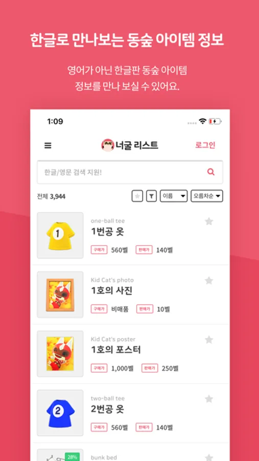 영어가 아닌 한글판 동숲 아이템 정보를 만나 보실 수 있어요.