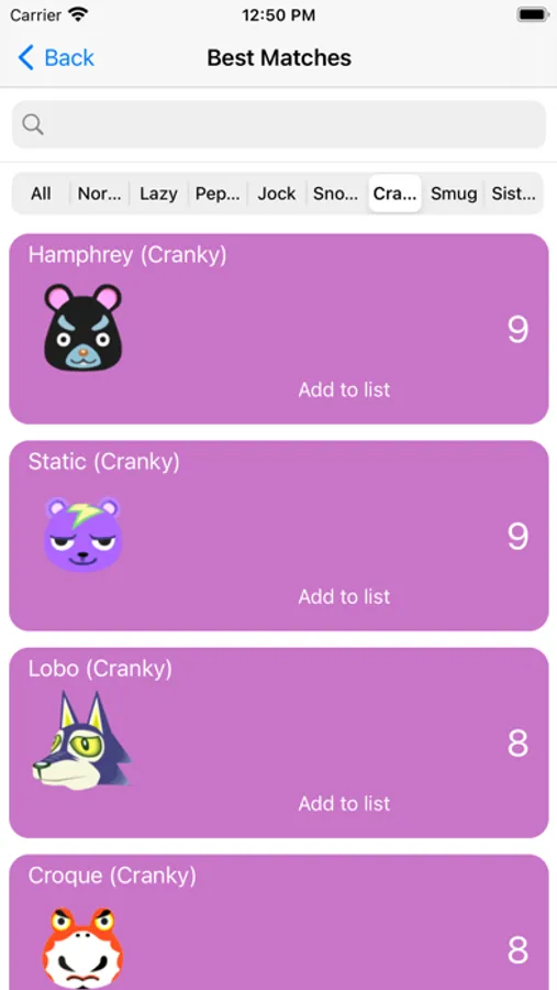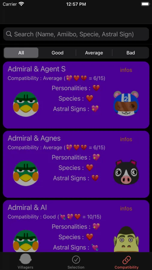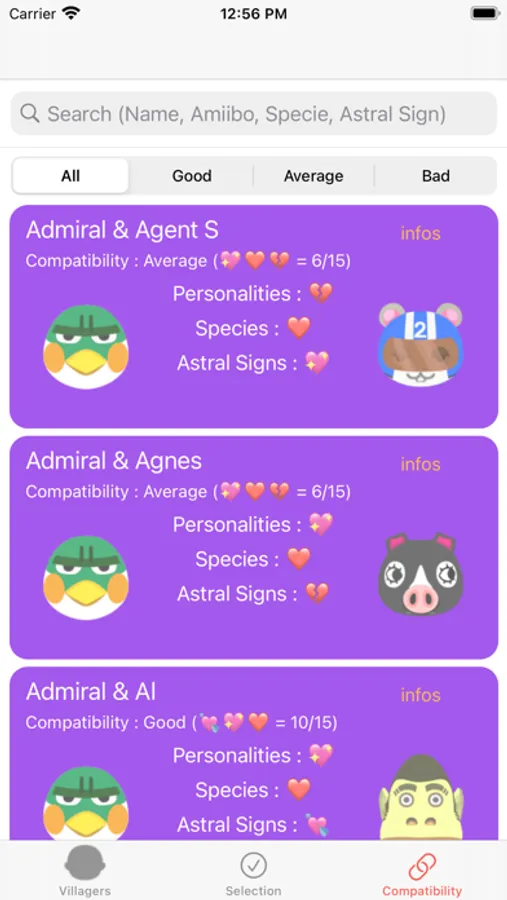 Compatibility listing for villagers in the game Animal Crossing: New Horizons.
