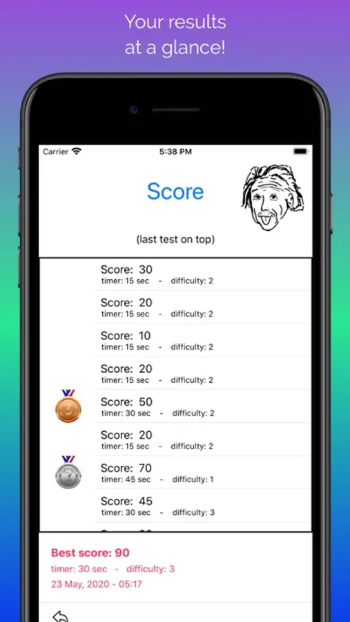 Do your best, beat your high-score and win medals… bronze, silver, gold or reach the ultime price: the Genius Einstein badge which is a real challenge to reach! Choose the operation you want: addition, subtraction, multiplication, division or combine any of those. The light blue arrow indicates where you stand in this race. Useful App for children who will learn with fun.