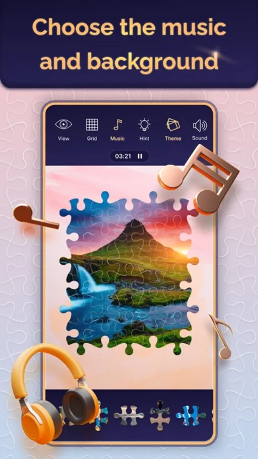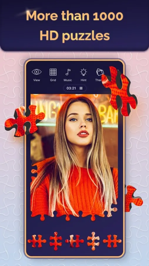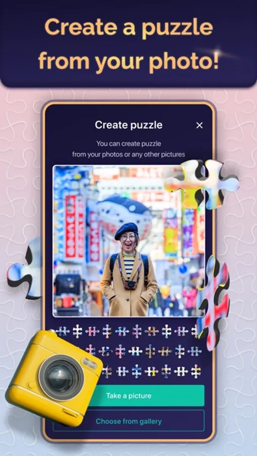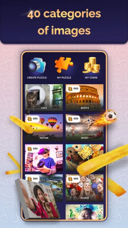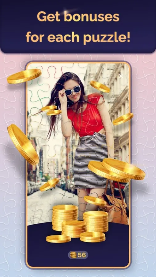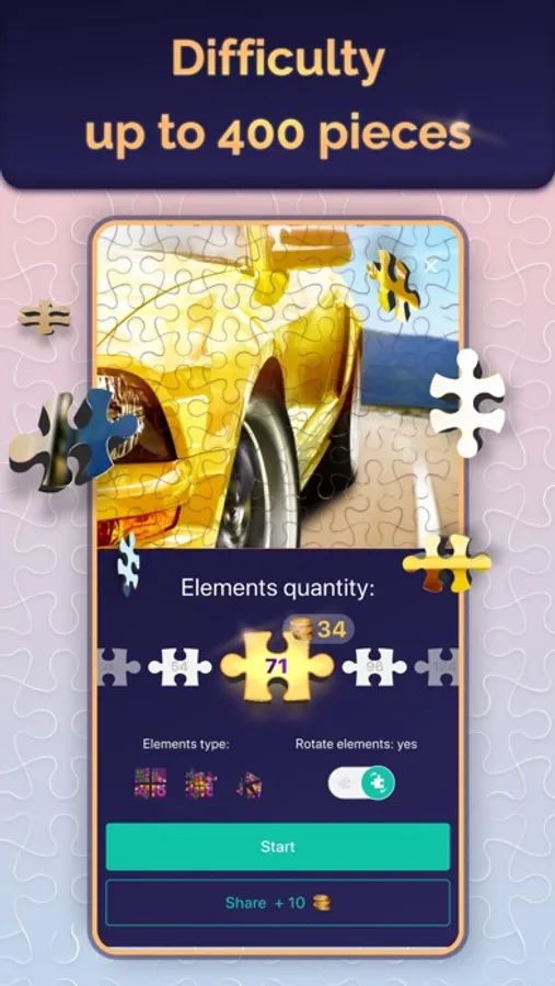 You can customize the difficulty of the game. A puzzle can contain up to 400 elements. You can set the shape and rotation of the puzzle pieces, create and put he most complex puzzles together. Earn more coins by solving the most challenging jigsaw puzzles.