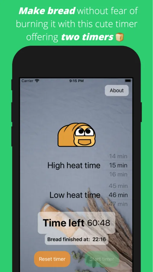 The Bread Alarm is an easy to use countdown timer to help you in bread making and baking. No need to worry about forgetfulness or getting caught up in other chores while bread making as this app will send you notifications once an interval is over.