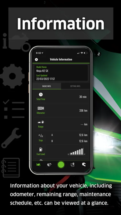 This function enables check on motorcycle information in regards to odometer, remaining distance, maintenance schedule etc.