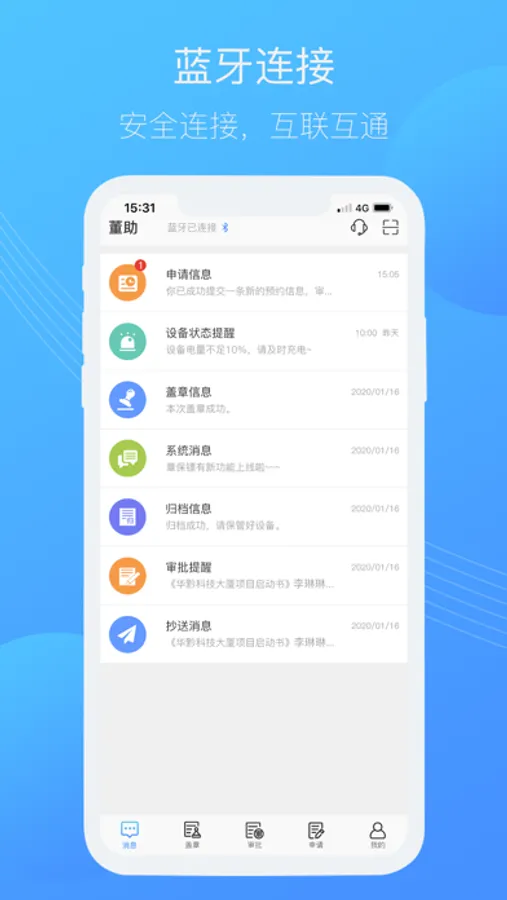 董助是一款辅助硬件产品使用的APP,以创新定义实体印章的管理新模式,上百家企业的用印助手。