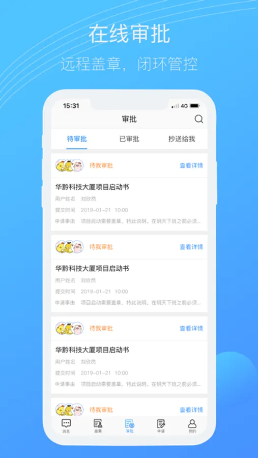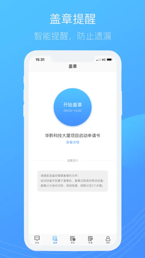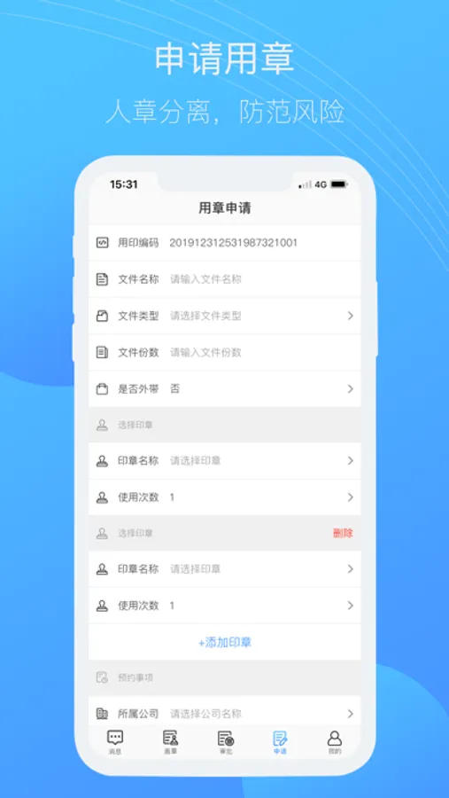 【线上申请、线下用章】-- 通过APP在线提交用章申请,审批通过之后在线下自助用章,用完即锁;