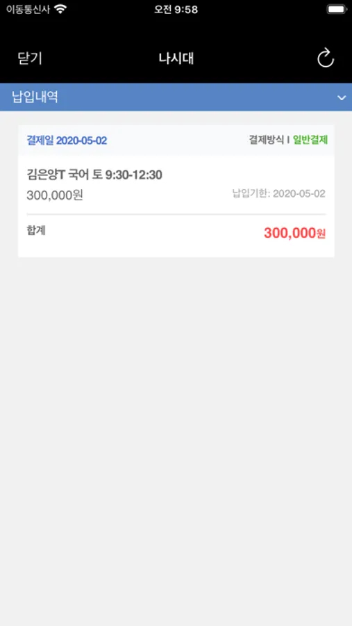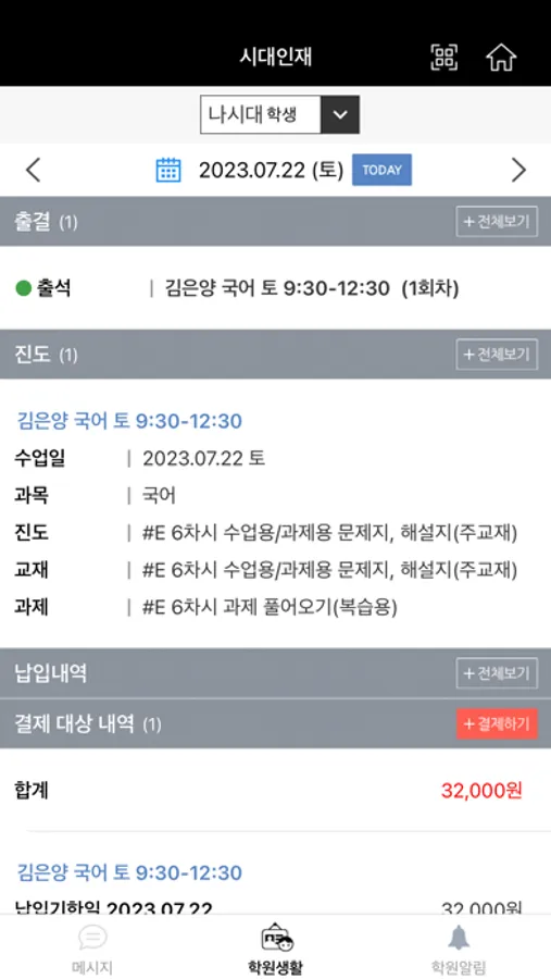 - 각 수강 강좌에 대한 수강료 납입/미납 상황 표시