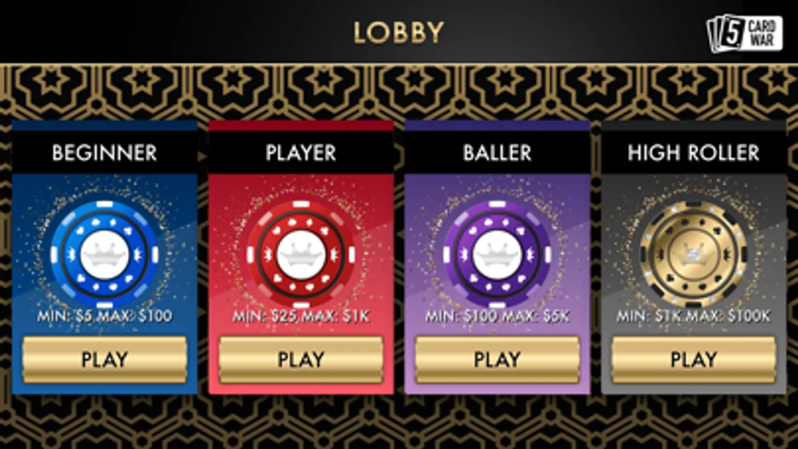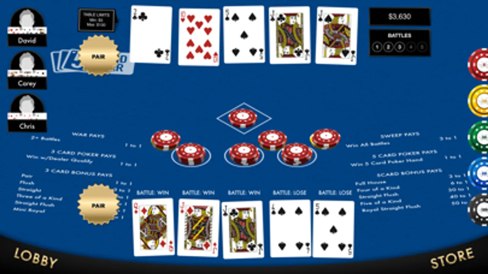 Five-Card War is an exciting new game combining three popular casino card games, War, Three-Card Poker, and Five-Card Stud Poker! Five rounds of exciting dealer versus player War “battles” which include both Three-Card Poker and Five-Card Stud Poker Hands to determine the winner! Poker winnings are according to the general Poker hand ranking system.