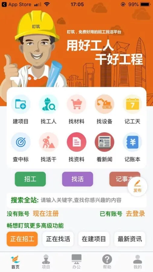盯筑,是中天科技全力打造的一款行业全能移动综合应用系统,以行业综合信息共享+移动应用系统+CP端管理为一体的方式,致力于为建筑业企业、主管单位、建筑工人等行业从业者提供在线发布招工信息、找活信息、在建项目管理、工人实名制管理、记工记账服务等为一体的全能信息发布应用。