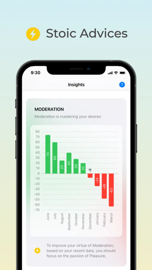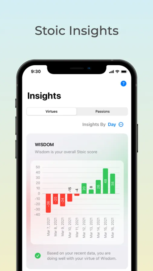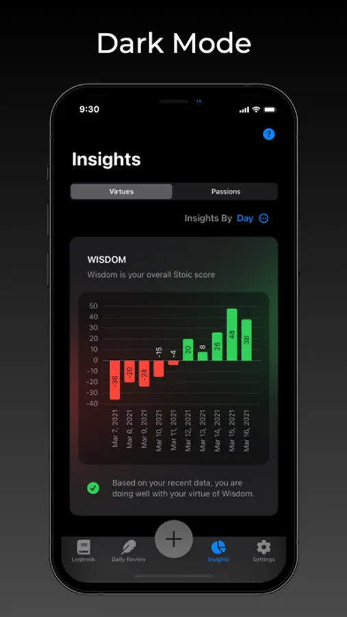 The Insights help you keep track of your Stoic progress. This makes it easier to act consistently in accordance with reason and virtue, the most important goal of life for any Stoic.