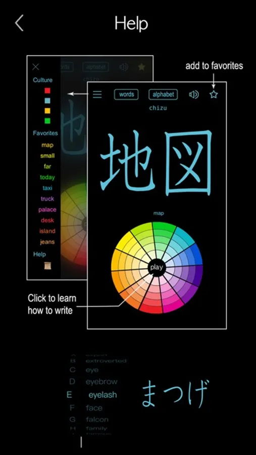 You can select the word in alphabetical order (English meanings) by clicking “words” in the menu bar. Basic everyday 1,000 Japanese words!