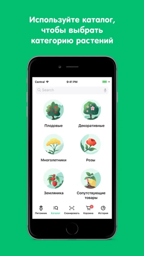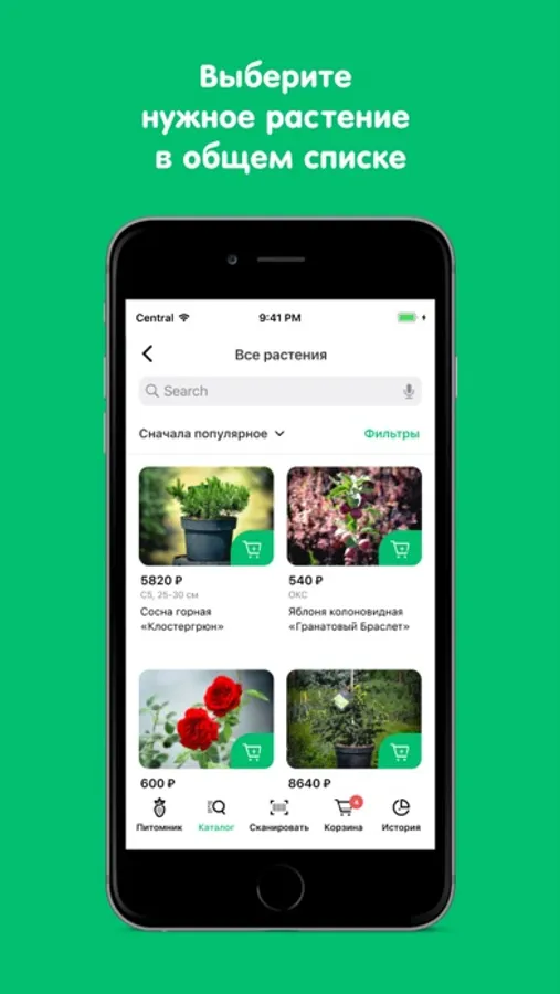 С помощью нашего приложения вы можете найти нужное растение, используя подробный каталог с фото. Саженцы разбиты на категории по применению, видами и сортам. Вы можете просматривать только интересующие вас растения, используя удобные фильтры в приложении.