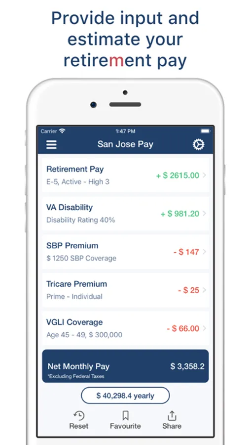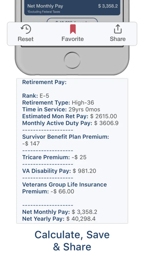 • One tap Reset - Reset your working calculation of retirement pay and start from scratch.