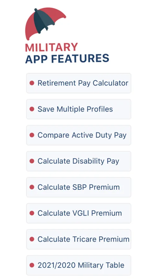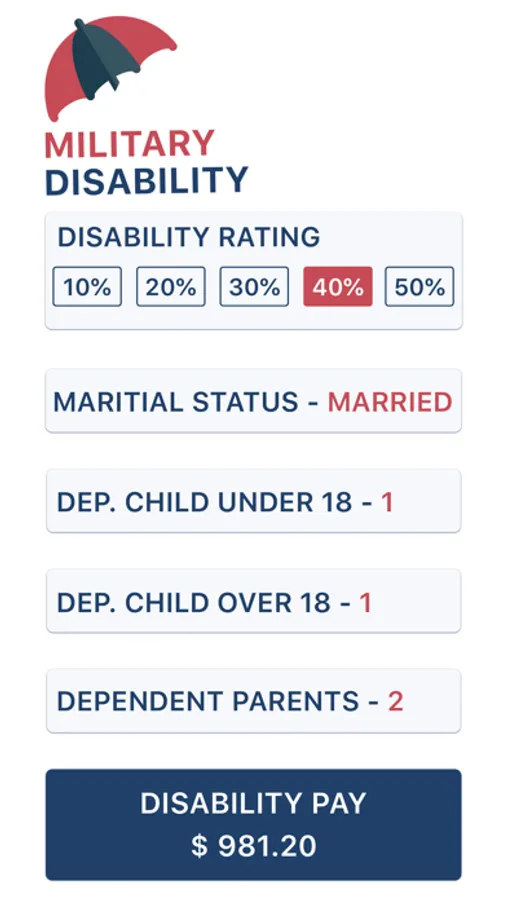 • Disability Pay: Calculate disability pay based on disability rating along with other options.