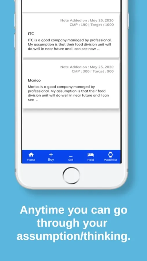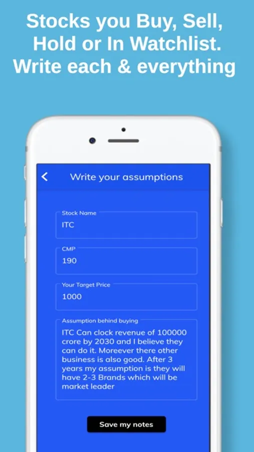 StockDiary helps you to keep track of the decision you make in the stock market. You can note down all your decision and always go through them. It helps you to improve your thinking/decision making power. Anytime you can check the company you bought/holding/sold or in watchlist is going in the same direction as you thought or there is some deviation.