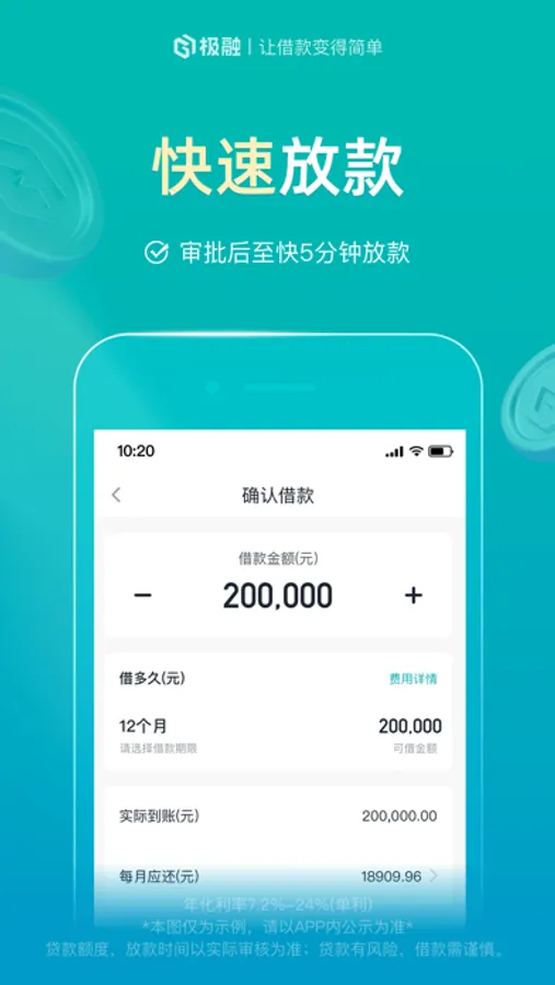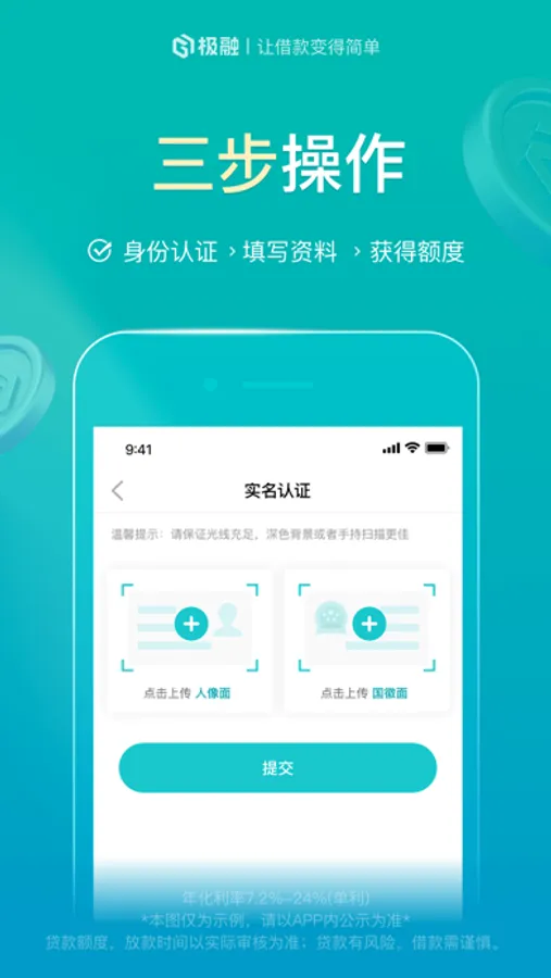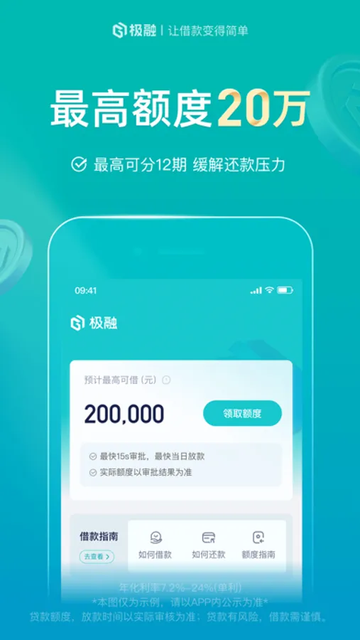 极融APP运用互联网安全技术和大数据技术,基于海量用户信用数据及行为数据为有需求的用户提供方便、稳定、便捷的金融借款服务,申请方便,息费透明,年化利率7.2%-24%(单利)。