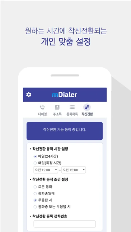 업무, 회의, 출장, 휴가 등 실시간 업무상태를 반영한 착신전환 설정이 가능합니다.