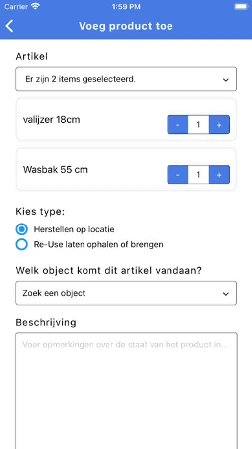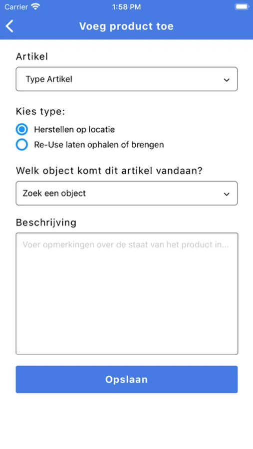 Gebruik als Re-Use-deelnemer deze app voor het registreren van de herbruikbare artikelen, scan de artikelen en breng ze naar het depot of laat ze ophalen. Koop vervolgens je hergebruikte artikelen in het websysteem of via deze app.