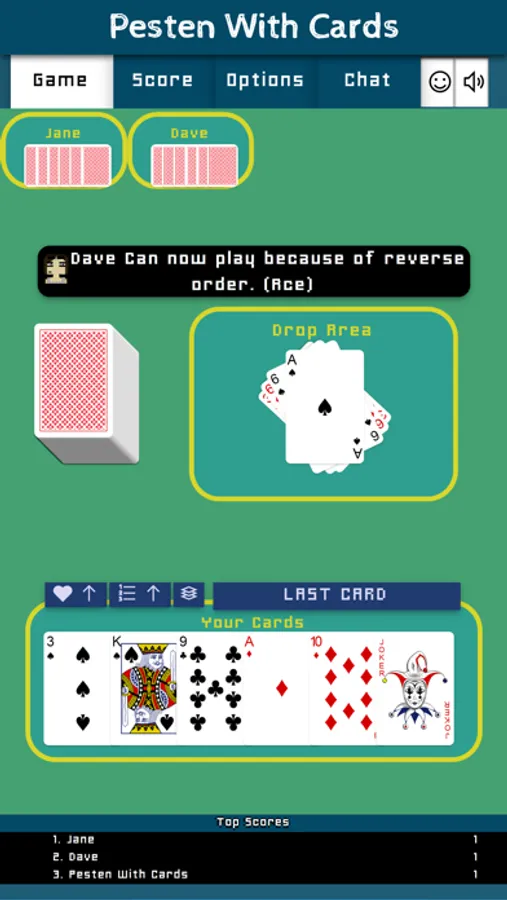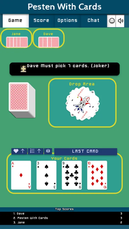 Pesten With Cards is a classic Dutch card game that litteraly means Bullying With Cards. Other countries play similair games like Mau-Mau, Crazy Eights, Shedding, Puque, Чешский Дурак, Фараон, Крокодил, Tschau Sepp or Uno. The goal of the game is to be first to get rid of all of one's cards. The winner will have to say "Last Card" before playing its winning card. If you forget to say "Last Card" when playing your winning card you must picks two cards as a penalty.
