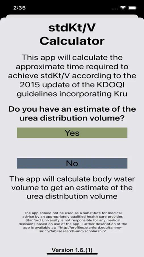 Disclaimer: the app should not be used as a substitute for medical advice by an appropriately qualified health care provided. Stanford University is not responsible for any medical decisions based on use of the app. Further description of the app is available at: https://profiles.stanford.edu/tammy-sirich?tab=research-and-scholarship