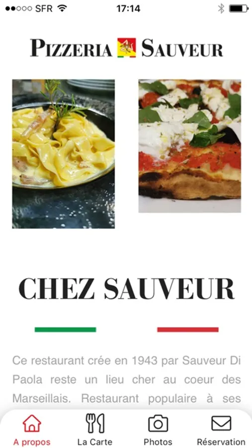 Application pour le restaurant Pizzeria Chez Sauveur. Retrouvez toutes les informations sur nos restaurants, les cartes et la réservation en ligne ! Ce restaurant crée en 1943 par Sauveur Di Paola reste un lieu cher au coeur des Marseillais. Restaurant populaire à ses débuts, “Sauveur” est rapidement devenu une référence en terme de qualité et de convivialité. Aujourd'hui nous en avons gardé “l'esprit”: Les méthodes de fabrication et de cuisson au four à bois de nos aînés restent identiques. La qualité et la fraîcheur sont pour nous une priorité et nous vous accueillons toujours avec autant de plaisir en ce lieu mythique pour que la table soit l'entremetteuse de l'amitié.