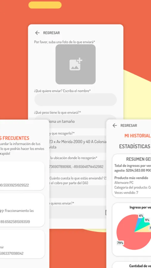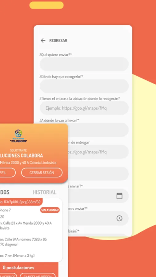 La aplicación permite a los comercios subir una solicitud de envío puede ser a un o varios destinos de entrega a través de un formulario que deben llenar previamente con las características del producto y destino.