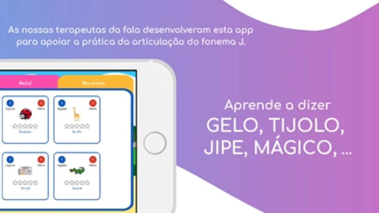 Esta app disponibiliza-te uma explicação do movimento correto da língua para produzires o som J, bem como mais de 30 imagens para praticares a articulação do fonema J nas palavras.