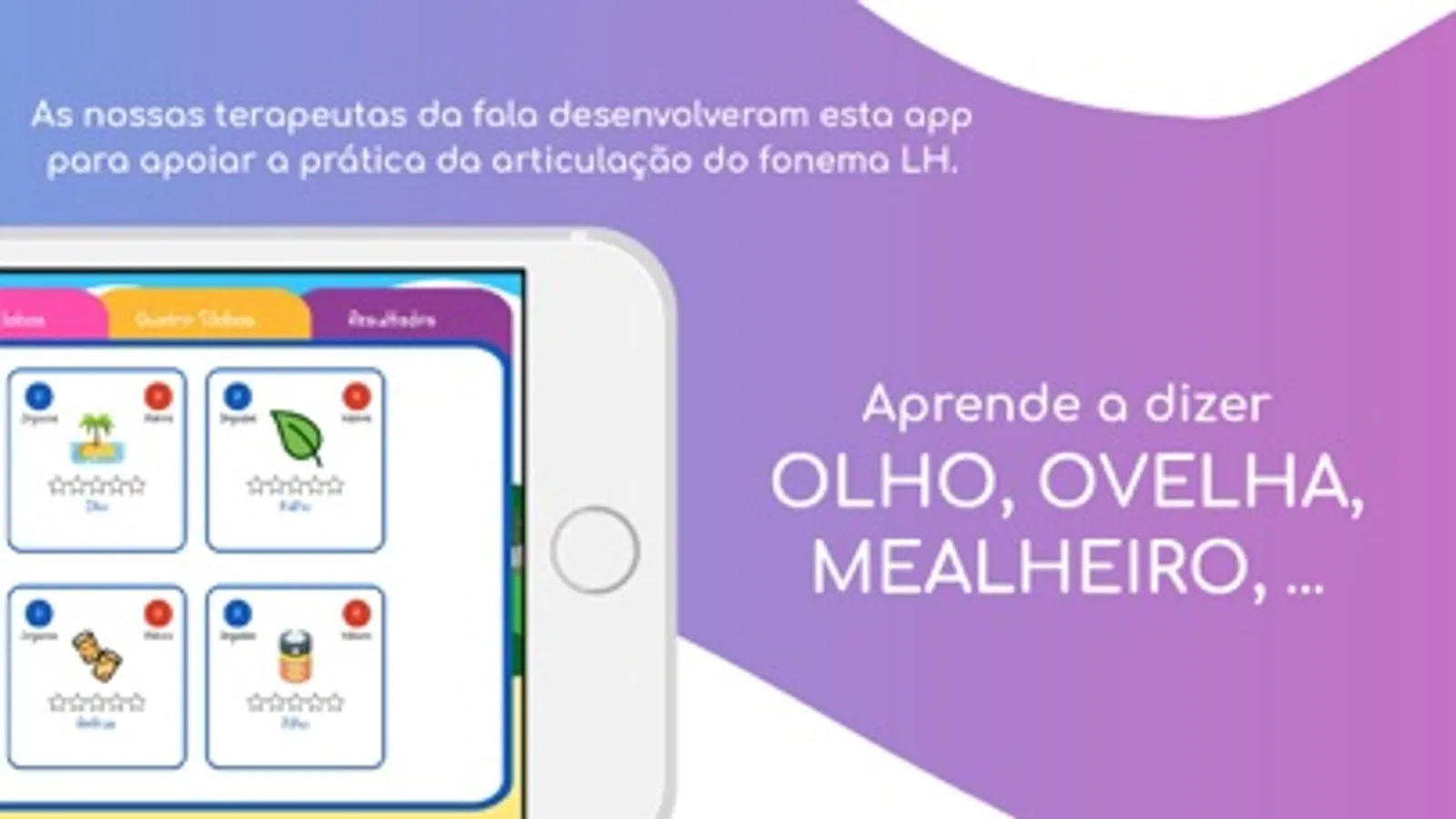 Esta app disponibiliza-te uma explicação do movimento correto da língua para produzires o som lh, bem como 33 imagens para praticares a articulação do fonema LH nas palavras.