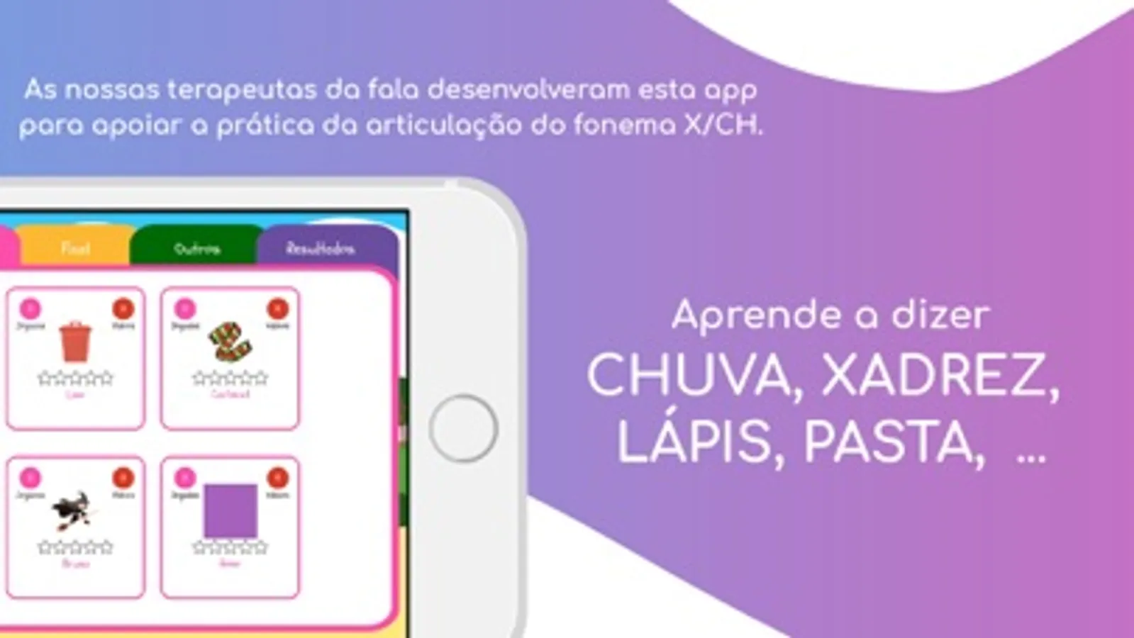 Esta app disponibiliza-te uma explicação do movimento correto da língua para produzires o som X/CH, bem como 60 imagens para praticares a articulação do fonema X nas palavras.