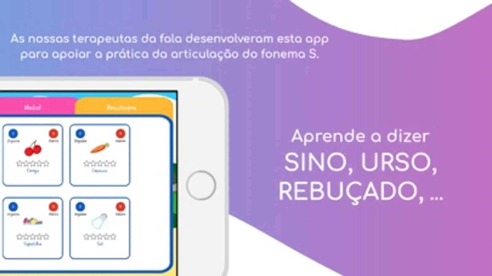 Esta app disponibiliza-te uma explicação do movimento correto da língua para produzires o som S, bem como 60 imagens para praticares a articulação do fonema S nas palavras.