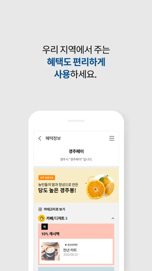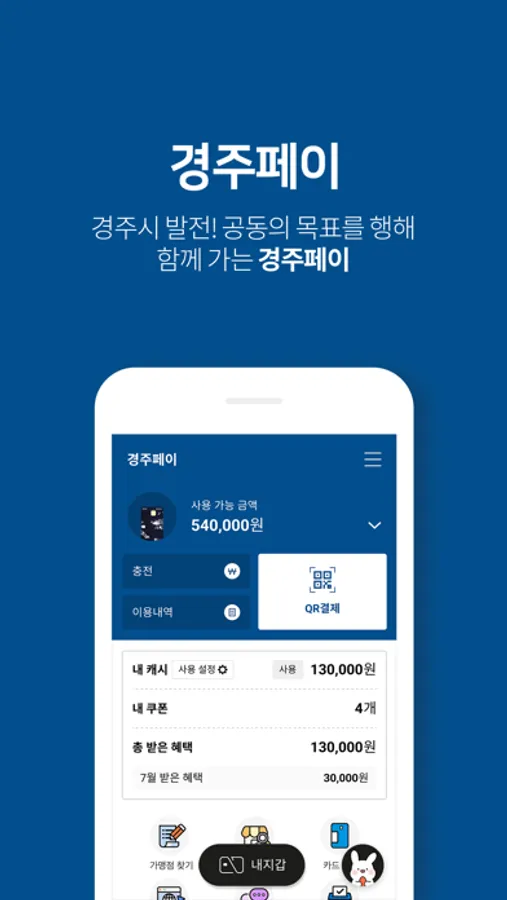 또한 지역경제 활성화를 위해 결제 시 캐시백을 제공하고, 경주시 내 특정 소상공인 매장에서 결제 시 할인을 지원합니다.
