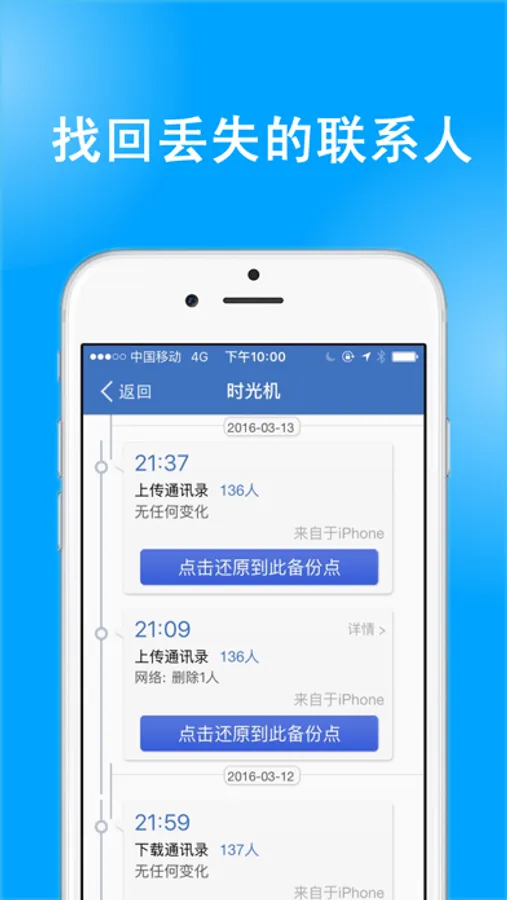 界面简洁:时光机方便易用,轻松找回丢失的联系人;