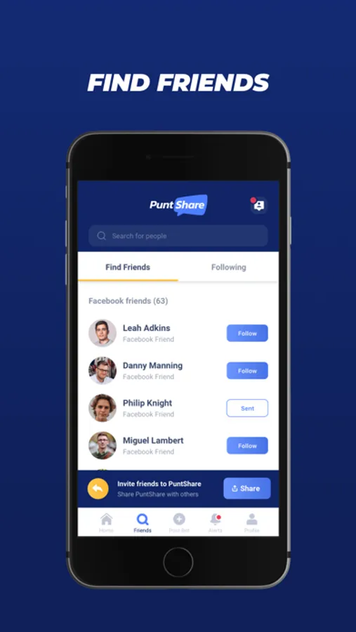 PuntShare allows easy access to add friends directly from facebook. Just sign in, follow your friends and discover new ones on the platform