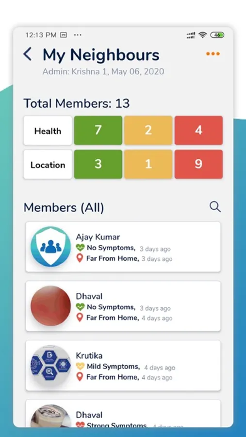 Users can create separate groups for family and friends, neighbors, or colleagues by inviting members to join a Group using a group code. Members within a group are required to self-report data such as their health symptoms, which is used to determine health and location status.