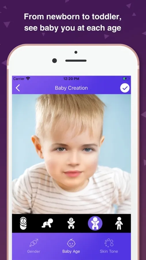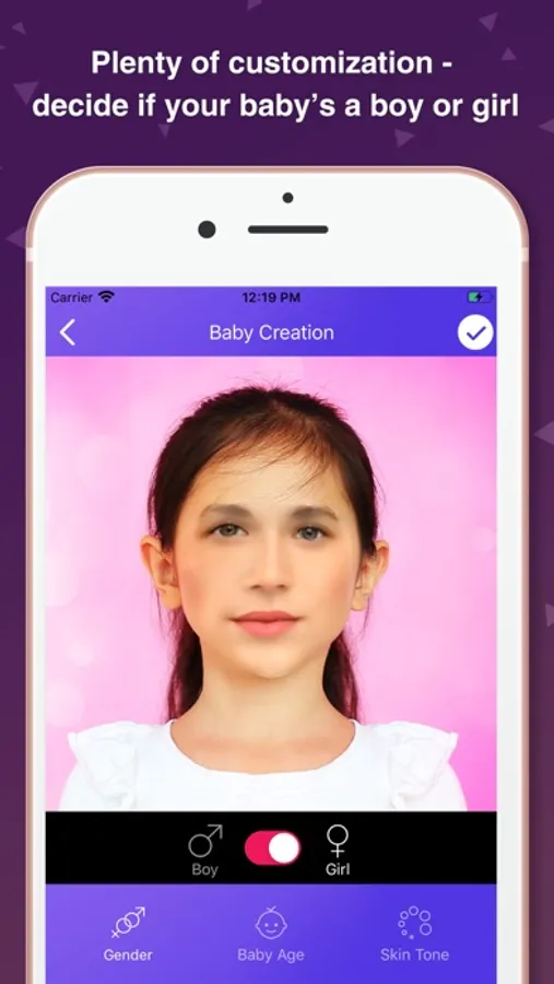 1. Create a baby - Chose the couples pictures and generate baby picture corresponding to the couple. Using computer vision we generate a baby picture with both parents face features included. You can change the baby age range from 0 to 4, Change gender of the baby to either boy or girl, Change skin tones. Create perfect baby you want. Create a baby with famous celebrity using the feature and show off to your friends.