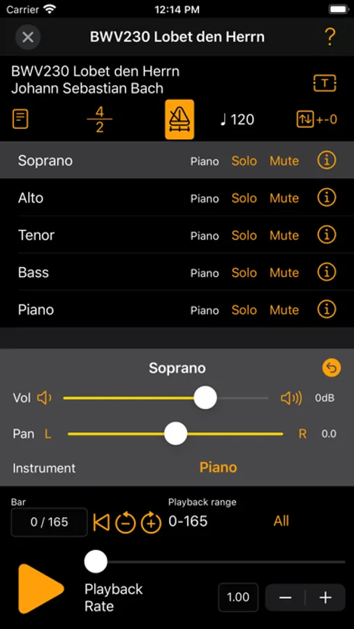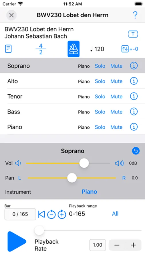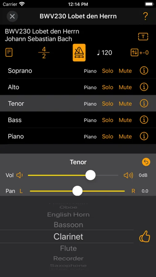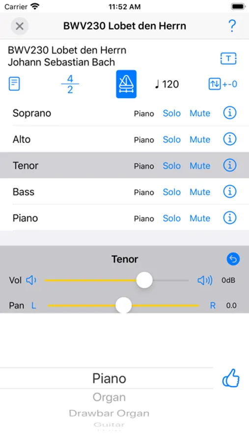 The app allows you set mute, soloed, volume, panning and instrument for each part.